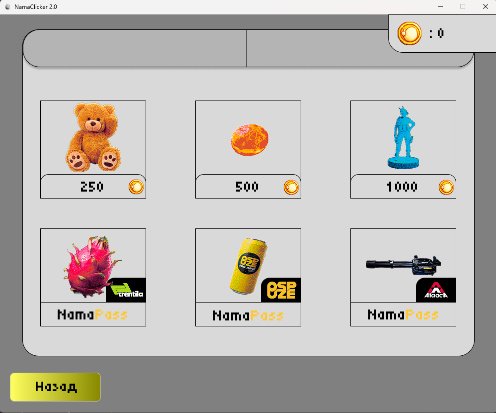 Кликер на Pygame (Python) с открытым исходным кодом. Ничего особенного. Зарабатывайте NamaCoins, забирайте награды из NamaPass и некоторые эксклюзивные от спонсоров. Прокачивайтесь, получайте ачивки и другое!